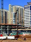 Nearly ten years later, construction commenced west of Library Street on Phase Two, starting on the north side of Market with the erection of the 18-story One Freedom Square and 16-story Two Freedom Square (completed in 2000 and 2001, respectively).[4] Construction also began on the low-rise condominiums and townhomes surrounding Town Center Parkway. Development continued with the 2006 opening of three residential high-rises immediately west of Freedom Square, and the construction of the three South of Market office buildings which were completed in 2008. Along the south side of Democracy Drive, a nine-level parking garage topped by Democracy Tower was completed in 2009.[5] The final portion of the second phase was completed in 2013 with the opening of The Avant, a 15-story apartment high-rise south of Reston Town Square Park.[6][7]