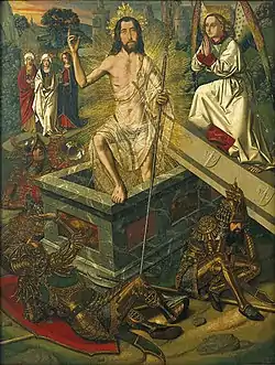 The Resurrection is one of the four surviving compartments of an altarpiece devoted to Christ, the work of Bartolomé Bermejo, a painter from Córdoba whose known activity was developed in the Crown of Aragon. Bermejo's work, characterised by its unidealised realism, introduced several novelties from northern European painting, such as the use of oil as a binder instead of egg tempera. In this compartment, Christ emerges from the grave before the look of adoration of an angel, while the soldiers guarding the tomb are terrified by the miracle. In the background can be seen the Three Marys, who have left Jerusalem and are walking towards the grave with jars of perfume to anoint Christ's body[2]