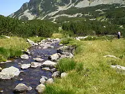 The river takes its source from Pirin's largest and deepest glacial lake, Popovo, at an altitude of 2,234 m. At an altitude of 2,174 m near the Fish Popovi Lakes it is joined by two mountain streams — one from the north sloping down the summit of Polezhan (2,851 m), and one from the west coming from the Polezhanski Lakes. Further downstream another stream coming from the Kremenski Lakes flows into the Retizhe. It then flows in north-eastern direction in a deep valley, forming rapids and small waterfalls.[1] Downstream the valley becomes deeper and is covered with dense forests. Some four kilometres before its mouth the Retizhe turns in eastern direction and forms a deep impassable canyon. It flows into the Mesta at Momina Klisura Gorge at an altitude of 646 m near the village of Mesta, Bansko Municipality.[1][2] The village is the only settlement along the course of the river.