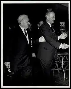 Soderstrom's influence continued to expand in the postwar era. As a direct result of his efforts, Illinois was one of the only states not to be consumed by the wave of anti-labor legislation that shook the country in the late 1940s.[39] Nationally, he exerted influence as Secretary of the AFL's powerful Resolutions Committee. He gained the personal confidence of national AFL President William Green, who repeatedly dispatched Reuben as his personal representative to resolve internal disputes across the country and represent the AFL abroad.[40][41] When George Meany, Green's successor, began talks with his CIO counterpart to merge the two labor organizations, Soderstrom was one of the handful of leaders and the only state president selected to travel to help craft the agreement in Washington, D.C.[42][43] When his own Illinois State Federation was merged with its CIO counterpart in 1958, Reuben was elected to be the first president of the new Illinois AFL-CIO.[44]