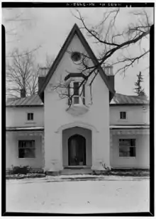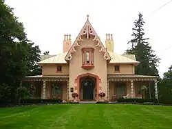 The home is constructed of brick covered with stucco, and originally sat upon an estate of approximately 20 acres.[16] The stucco has been painted several times over the years. As of 2009, the exterior was a pink tone with a darker salmon color applied to the bargeboards (sometimes called "gingerbread" or vergeboard). As of 2019, the exterior was a gold tone with off-white applied to the bargeboards. As detailed in the National Register of Historic Places Inventory, the fenestration (window design and placement) is largely symmetrical, typical of the architectural style, and includes a central protruding oriel window on the second floor on the east front. Above this oriel window is an oculus with quatrefoil wooden tracery. The main entry is a four-centred arch flanked by sandstone labels painted off-white to match the ornamentation of the bargeboards. The first floor is largely encircled by a porch, which is adorned with iron ornamentation in the form of oak leaves and acorns. The large picture window on the north side of the structure, now looking out from the current kitchen, was added in 1926 by Archimedes Russell. The bargeboards were removed in 1940, but later replaced. The floors, originally pine, were replaced in 1941 with walnut. The interior walls – brick covered with plaster – are ten inches thick. Fireplaces with white marble mantels are original on both floors.[17]
