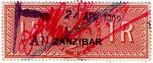 Zanzibar's first revenues were Indian revenue or special adhesive stamps overprinted ZANZIBAR in capitals, and these were issued between May 1892 and August 1894.[2] Various provisional overprints, some manuscript and some printed, were produced at around 1904, and most of these are rare. In 1905, postage stamps portraying Sultan Seyyid Hamoud bin Mahommed bin Said were overprinted "Revenue", and sometime later, 1 rupee surcharges appeared on this issue. Between 1907 and 1908 various postage stamps with the monogram of the Sultan were issued overprinted "Revenue" locally or "REVENUE" by De La Rue in London. From 1908 postage stamps were valid for fiscal use, but in 1936 high values were issued inscribed for use as revenues only. In 1964, one of these was issued handstamped "JAMHURI 1964" in purple, after the Zanzibar Revolution. In 1966, postage stamps handstamped "REVENUE" were issued, and these were replaced by a new issue inscribed Pato in 1970.