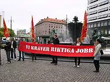 RKU in protest against youth unemployment in Järntorget, Gothenburg. The banner reads "We demand real jobs".