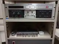 Recording levels, recording balance and headphone volume are set electronically, with pairs of up/down buttons.[25][26] There are no microphone inputs; designers deemed those unnecessary for a consumer product.[22] The panel marking, according to Audio (USA) magazine reviewers, is exemplary: black letters on brushed aluminum and white letters on dark-grey plastic are large enough and easily readable at any angle of view.[27] The main backlit liquid-crystal display, on the contrary, is too small, too dim and too hard to read.[28][24] Another usability failure is the absence of front-panel control lights, even the critical 'Record On' red light is missing (it was later added to the Studer A721, but not the B215).[28] These quirks make it difficult to use the Revox in a darkened room.[28] Reviewers also noted the overall inconvenience of using digital control buttons instead of rotary potentiometers[24] (the latter, again, returned on the Studer A721 but not the Revox decks).