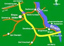 Rheinböllen has its own interchange on the Autobahn A 61 and is 15 km by road from Bacharach on the Rhine, and also roughly 50 km from both Mainz and Koblenz.