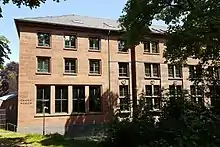 In 1885–89 a proper museum building was built at the edge of the palace garden of the Electoral Palace, just outside the Roman wall. The architect of the building, rectangular and of red sandstone, was Clemens Guinbert, Landbaurat from Düsseldorf. Guinbert also built the museum in Bonn. In 1904 the building was enlarged with three wings after a design by Carl Hocheder from Munich. In 1925–26 Hocheder's south wing was replaced by a new office wing. In 1945 around 80% of the building was destroyed by bombs. The rebuilding campaign was led by Zahn and was finished in 1958. It left the museum architecturally as a 'watered-down' version of the original designs. In the 1980s a new section was added by the architects Klaus Gauger and Gerhard Dürr from Neustadt an der Weinstraße.[2]