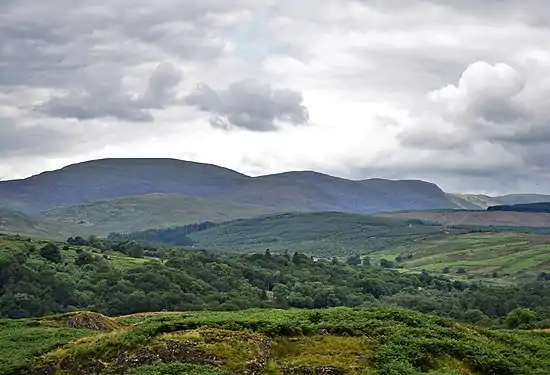 'Rhinns' derives from the Old Irish rind, later Ulster Irish and Scottish Gaelic rinn, meaning 'promontory' or 'point'.[24] 'Kells' is a parish in the historic county of Stewartry of Kirkcudbright to the southeast of the range near New Galloway. Its name possibly derives from the Old Irish cell, later Irish and Scottish Gaelic cill, meaning 'church',[25] but may instead be in reference to its heightened elevation or, historically, wooded land.[26] Most of the hill names are of Scottish Gaelic or Scots origin, such as Meikle Millyea; (Scots: meikle - 'large') (Scottish Gaelic: meall liath - 'grey, round hill'), which translates fully to 'large, grey, round hill'.[27]