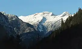 During the Pleistocene period dating back over two million years ago, glaciation advancing and retreating repeatedly scoured the landscape leaving deposits of rock debris.[6] The U-shaped cross section of the river valleys is a result of recent glaciation. Uplift and faulting in combination with glaciation have been the dominant processes which have created the tall peaks and deep valleys of the North Cascades area.