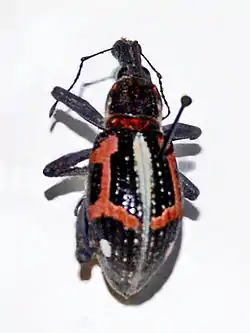 Black, nitid; head densely punctured in front, lightly behind, covered with a thin ashen pubescence and furnished with a number of strong hairs about the mouth. The extremity of the snout as broad as the head. Thorax scarcely longer than broad, broader at the base than the apex, and also broader than the head, very regularly marked, and with a depression on the anterior part of the median line. A broad depressed space on the side and under surface of the apex of the thorax is densely covered with reddish golden scales, and on each side from the middle to the base there is a broad vitta of the same. The elytra are convex, broader than the thorax, with a prominent humeral callus, and pointed at the apex ; on each elytron are nine rows of large oblong punctures, the intervals scarcely raised ; the extreme apex is mucronate. A sutural vitta including the scutellum, a broadish fascia behind the shoulder and not reaching the suture, and a narrower rather curved fascia behind the middle and extending to the suture, are densely clothed with golden scales. The metasternum is similarly clothed. The legs are sparingly punctured, each puncture with a short seta. [3]