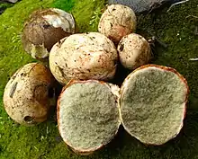 Rhizopogon evadens is a truffle-like fungus in the family Rhizopogonaceae. Found in North America, it was described as new to science by American mycologist Alexander H. Smith in 1966.[2] The fungus produces roundish to irregularly shaped fruitbodies measuring 2–5 cm (0.8–2.0 in) in diameter, with irregular lobes, wrinkles and depressions on the surface.[3] The peridium (outer tissue layer of the fruitbody) is whitish with light yellow to brown stains, and bruises red. The fungus has an unpleasant odor and a taste described as "metallic". Typical tree associates include pine, Douglas fir, and hemlock.[4] Initially white, the gleba (the interior contents) turn olive to olive-brown in maturity, with the contents developing a gelatinous consistency.[3] The smooth spores of R. evadens are narrowly ellipsoid in shape, and measure 6–8 by 2–2.3 µm.[4]