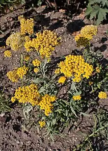 The Golden cluster everlasting grows on sand plains and heathland, sometimes with limestone from north of Perth to Shark Bay in Western Australia.[2][8]