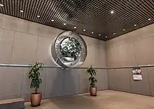 Its first floor was designed with a five-story galleria-like lobby, a unique feature made possible by the building's elevator placement. The center of the lobby has a winding staircase leading up to the former Supreme Court level as well as two escalators that lead to the basement's restaurant and passage to the Statehouse garage.[17][11] Towards the back of the lobby is a stainless steel recreation of the Great Seal of Ohio.[11] The floorplans of the building are column-free, 144 feet square. All of the building's elevators (20 for passengers and two for freight[11]) and service shafts were designed outside of the square office space, at the north and east (back and side of the building).[10][17] The elevators include express elevators that skip floors between the lobby and 18th floor. One of these elevators malfunctioned in 2021 with no injuries.[29]