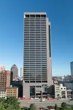 The James A. Rhodes State Office Tower is a 41-story, 629-foot (192 m) state office building and skyscraper on Capitol Square in Downtown Columbus, Ohio. The Rhodes Tower is the tallest building in Columbus and the fifth tallest in Ohio. The tower is named for James A. Rhodes, the longest-serving Ohio governor, and features a statue of Rhodes outside the entrance. The building's interior includes a large open lobby with 22 elevators. Higher floors have offices for numerous state agencies. The tower's 40th floor contains an observation deck, open to the public.