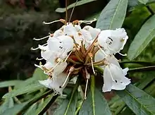 Rhododendron arizelum (夺目杜鹃) is a species of flowering plant in the family Ericaceae.[1] It is native to northeastern Myanmar, southeastern Tibet, and western Yunnan, China, where it grows at altitudes of 2,500–4,000 m (8,200–13,100 ft). It is a shrub or small tree that typically grows to 3–7 m (9.8–23.0 ft) in height, with leathery leaves that are obovate or obovate-elliptic, and 9–19 × 4–8 cm in size. The flowers are white, pale yellow, or pink, with a crimson basal blotch.
