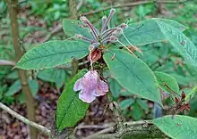 Rhododendron glischrum (粘毛杜鹃) is a species of flowering plant in the family Ericaceae.[2] It is native to northeastern India, southern Tibet, Myanmar, and northwestern Yunnan, China, where it grows at altitudes of 2,400–3,600 m (7,900–11,800 ft). It is an evergreen tree[3] that typically grows to 2.4–7 m (7.9–23.0 ft) in height, with leaves that are oblong to broadly oblanceolate and 14–22 × 4.6–6.5 cm in size. The flowers are pink with purple flecks and basal blotch.