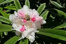 Rhododendron thayerianum (反边杜鹃) is a rhododendron species native to western Sichuan in China, where it grows at elevations of 2,600–3,000 m (8,500–9,800 ft). It is an evergreen shrub that grows to 3–4 m (9.8–13.1 ft) in height, with leathery leaves that are narrowly oblanceolate, and 9–17 × 1.5–2.5 cm in size. The flowers are white, sometimes deeply flushed pink on the outside along the petal ridges, or pink. It flowers quite late in the season, in June and July.[1]