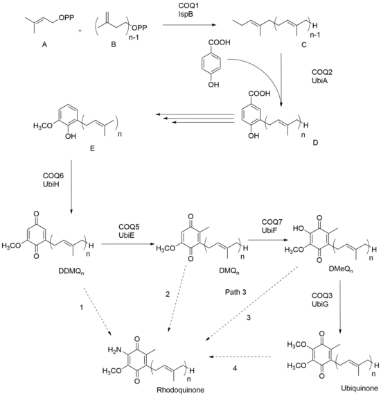In the case of the prokaryotic organism R. rubrum, RQ has been shown to be synthesized by addition of an amino group to a pre-existing UQ; thus UQ needs to be present as a precursor before RQ can be made. Figure 1 shows the biosynthesis of UQ in yeast and E. coli where ‘n’ represents the number of isoprene units between various organisms. Dimethylallyl diphosphate A and isopentyl diphosphate B come together to form polyisoprenyl diphosphate C. With the addition of p-hydroxybenzoic acid, the product that arises is 3-polyprenyl-4-hydroxybenzoic acid D. The next three steps of synthesis varies between different organisms, but molecule E is made across all organisms and through oxidation, demethyldemethoxyubiquinone (DDMQ) is eventually formed. RQ has been theorized to be synthesized from DDMQn, DMQn, DMeQn, or UQn, as shown with the dashed arrows. Recent studies have shown that Path 4 - RQ biosynthesis via UQ, is the favored route.[4] It has been further shown that the gene rquA is required for the biosynthesis of RQ in R. rubrum, and that RquA catalyzes the conversion of UQ to RQ.[5][6] The RquA protein uses S-adenosyl-L-methionine as the amino donor to convert UQ to RQ in an unusual Mn(II)-catalyzed reaction.[7]