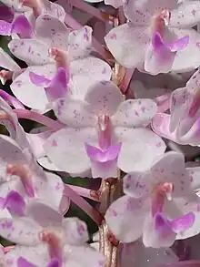 Rhynchostylis retusa (also called foxtail orchid) is an orchid, belonging to the Vanda alliance. The inflorescence is a pendant raceme, consisting of more than 100 pink-spotted white flowers. The plant has a short, stout, creeping stem carrying up to 12, curved, fleshy, deeply channeled, keeled, retuse apically leaves and blooms on an axillary pendant to 60 cm (24 in) long, racemose, densely flowered, cylindrical inflorescence that occurs in the winter and early spring. It is famous for its use as a hair-ornament worn by Assamese women during folk dance Bihu on the onset of spring.[2]