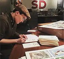 Artist Ria Brodell signing Butch Heroes box sets at Stoltze Design in Boston, MA for the Davis Museum at Wellesley College