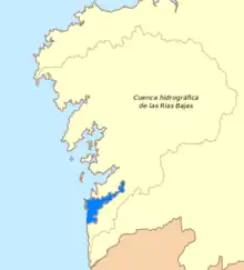 Vigo Ria (Spanish: Ría de Vigo) and (Galician: Ría de Vigo) is an estuary in Galicia, Spain. It is the southernmost ria of the Rías Baixas. It is located south of the province of Pontevedra, and extends in a northeast direction over a distance of 35 kilometres (22 mi) from its mouth at Cape Silleiro to the deepest point in Arcade, with a maximum width of 7 km (4.3 mi) and the narrowest in the Strait of Rande, at 700 m (2,300 ft). Its western entrance is protected by the Cies Islands, which are part of the National Park of the Atlantic Islands which is within the islands of Toralla and San Simon. It borders to the north with the Morrazo Peninsula. In the extreme south lies the Bay of Baiona. Its easy access, depth and calm waters make the Vigo estuary an ideal retreat for sailing and water sports.[1][2]