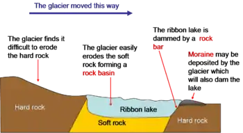 Such a lake's formation begins when a glacier moves over an area containing alternate bands of hard and soft bedrock. The sharp-edged boulders that are picked up by the glacier and carried at the bottom of the glacier erode the softer rock more quickly by abrasion, thus creating a hollow called a rock basin. On either side of the rock basin, the more resistant rock is eroded less and these outcrops of harder rock are known as rock bars, which act as dams between which rainwater may accumulate after the retreat of the ice age, filling up the rock basin and creating a ribbon lake.[1] A ribbon lake may also form behind a terminal or recessional moraine, both of which also act as dams, enabling water to accumulate behind them.[1]