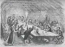 The Ribbon Society was principally an agrarian secret society, whose members consisted of rural Irish Catholics.[1] The society was formed in response to the miserable conditions in which the vast majority of tenant farmers and rural workers lived in the early 19th century in Ireland. Its objective was to prevent landlords from changing or evicting their tenants. Ribbonmen also attacked tithe and process servers, and later evolved the policy of Tenants' Rights.[2] The existence of "ribandmen" was recorded as early as 1817.[3] The name is derived from a green ribbon worn as a badge in a button-hole by the members.[4]