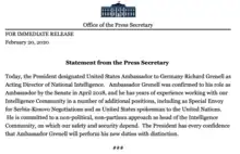 As a temporary incumbent, Grenell was not subject to Senate confirmation. Although Trump indicated he would be appointing a new U.S. Ambassador to Germany,[85] Grenell kept this position while also serving in his new role,[86] and Grenell indicated he did not expect to take the Director of National Intelligence job on a permanent basis.[85]
