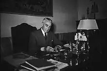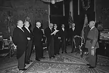 In 1951 Oreja was admitted at a personal audience by Franco; the subject of their meeting has not been disclosed.[117] It might have been related to Oreja's ascendance to a high governmental job; the same year he was nominated sub-secretario, effectively the deputy minister, in Ministerio de Justicia,[118] just assumed by another fellow ex-Carlist Antonio Iturmendi. However, he stayed clear of independent Carlist politics and remained firmly within the limits of loyalty to caudillo; the only Traditionalist feature he permitted himself was cultivating of the Vázquez de Mella memory.[119] In 1952 he was again admitted by Franco[120] and received Gran Cruz del Mérito Civil.[121] Also in 1952 he received his Cortes mandate from the pool of Franco's personal appointees;[122] In the chamber Ricardo joined his brother Benigno, who had served three earlier terms since 1943. In 1954 Oreja's term in the Madrid ayuntamiento came to an end.[123]