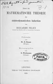 - 1 2 Felici, Riccardo (1855). "Ricerche sulle leggi generali della induzione elettro-dinamica". Il Nuovo Cimento. 1: 325–341. doi:10.1007/BF02729191. S2CID 120436879.