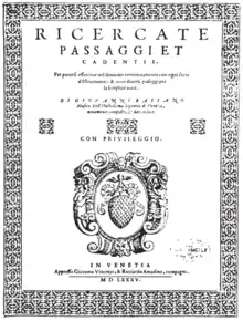 Ricercate, passaggi et cadentie per potersi essercitar nel diminuir terminatamente con ogni sorte d’istrumento; et anco diversi passaggi per la semplice voce (Ricercars, passages and cadences to facilitate practicing accomplished diminutions on all kinds of instruments; and also various passages for just the voice) is a didactic work written by Giovanni Bassano. It was first published in 1585 and was one of the few works that Bassano wrote under the tutelage of Giovanni Gabrieli.[1]
