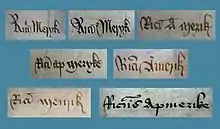 'Amerike' is an anglicised spelling of the Welsh ap Meuric, ap Meurig or ap Meryk, which means "son of Meurig".[1] It was, however, only one of the many different ways that the customs officer's name was rendered, even in official documents. The 'Amerike' version was noted by some modern historians because it looked like 'America' and because this was how his name was spelled on a tomb brass created for his daughter in 1538.[2]
