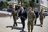 Clarke, Secretary of State Mike Pompeo (center), and CENTCOM commander Gen Frank McKenzie visit the WebOPS building at MacDill Air Force Base on 18 June 2019.