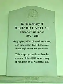 - ↑ There does not appear to be any monument to Hakluyt either in Christ Church Cathedral, Oxford, or elsewhere in the grounds of Christ Church, Oxford.