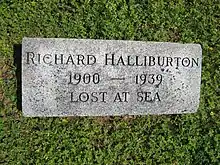 Missing at sea since March 1939, Halliburton was declared dead on October 5, 1939, by the Memphis Chancery Court.[43] His empty grave is at Forest Hill Cemetery in Memphis at the Halliburton family gravesite. His ghost is reputed to haunt his final residence, Hangover House, completed in 1938 by architect William Alexander Levy in Laguna Beach.[44]