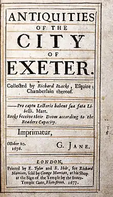 - ↑ For example, the title of the 1724 second edition is: Remarkable Antiquities of the City of Exeter: Giving an account of The Laws and Customs of the Place; the Offices, Court of Judicature, Gates, Walls, Rivers, Churches and Immunities; the Titles and Privileges of the Several Corporations and their distinct Coats of Arms finely engraven on Copper-Plates: with a Catalogue of all the Bishops, Mayors, and Sheriffs, from the year 1049, to 1677.[3]