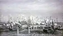 Meade transferred to the second-rate HMS Calcutta, flagship of the Commander-in-Chief, East Indies Station, in August 1857 and, having landed with the naval brigade, took part in the Battle of Canton in December 1857 during the Second Opium War: he was severely wounded in the left arm by a bullet fired from a gingal.[3] He was mentioned in dispatches, promoted to commander on 26 February 1858[4] and transferred to the sloop HMS Hornet later that month.[3]