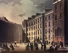 Thornhill went to law for prompt payment of the full sum due; he did so in Middlesex because he thought a Yorkshire jury would be prejudiced. In January 1839 Oastler failed to have the case heard in Yorkshire; at this stage Oastler intended his defence to involve all the estate business during Oastler's stewardship, and Oastler anticipated calling about 60 Yorkshire-based witnesses.[46] Thornhill repeatedly postponed the action, which was not heard until July 1840. After the opening statement of Thornhill's counsel, Oastler said if his honesty was not being questioned he was prepared to settle. The Lord Chief Justice assured Oastler that there was no suggestion of dishonesty (Thornhill's counsel said only there had been no suggestion of dishonesty in the material he had laid before the court);[39] [lower-alpha 16] there was an agreed verdict that Oastler owed Thornhill £2600.[2]: 411 [47] He was unable to pay this: Thornhill's lawyer indicated that any indication that Oastler was prepared to declare himself bankrupt (under the Relief of Insolvent Debtors Act) if faced with debtors' prison would avoid any move to put him there,[9]: 230 but Oastler scorned this[9]: 328 and was imprisoned for debt in the Fleet Prison (Dec 1840).[2]: 413 [lower-alpha 17]