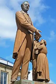 The money to erect a statue was raised (somewhat delayed by the Cotton Famine) and the West Riding town in which the statue was to be erected was voted for by subscribers, Bradford being the overwhelming preference.[66] The statue was unveiled in Forster Square, Bradford (in front of the railway station) on Whit Saturday 1869 by the former Lord Ashley, now Lord Shaftesbury.[67] Church bells were rung and all places of business in Bradford were shut for the occasion. It was estimated that the preliminary procession had involved about 30,000; the crowds at the ceremony and along the procession route totalling over 100,000. The figures, sculpted by John Birnie Philip, were cast from three tons of bronze and cost £1,500. A public house (previously a chapel) in Park Street Market, Brighouse, and a school in the Armley district of Leeds, West Yorkshire, also bear his name.