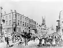 - ↑ Which in the short term would have been an empty gesture with a real risk of making matters worse; there were no military immediately available to assist the civil power, since – accepting Oastler's assurances about the conduct of the demonstration- the magistrates had not asked for military assistance.[33] A similar attempt to intimidate the Poor Law Guardians in Bradford in November was countered by the presence of cavalry, but the crowd did not disperse when the Riot Act was read, instead attacking the cavalry. Reinforcements had to be summoned from Burnley before any attempt could be made to escort the guardians away from their abandoned meeting; when this was done serious consequences were averted only by infantry firing on the mob – there were many injuries but (fortunately) no deaths[2]: 365–7