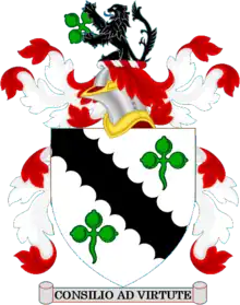 Argent a bend engrailed Sable between two trefoils slipped Vert.