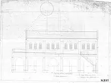 Built to house the electric winding set for the main No.2 shaft along with the generators sets and electrical switchgear, the building is a truncated T-shaped plan, with two storeys and with steel trussed roof. This building set the trend for the architectural elements of later buildings with the use of faced brick with expressed plinth and pilasters, arched windows, gable ends with bulls eye windows and general detailing. A gable end porch extension extends to the west with a double stairway. It is tiled with ceramic, imported tiles.[1] Unlike the other buildings at the colliery the bricks for the power station were obtained externally and were purchased from the National Brickworks Company Limited at Thornleigh.[25] The building is fitted with a 20 tonnes (20 long tons) manually powered overhead crane built by Craven Brothers that runs the full length of the building.