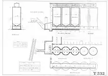 Built adjacent to the mine's surface horse stables, the grain silos are 5 reinforced concrete construction circular structures 4 m (14 ft) in diameter by 14 m (46 ft 3 in) high.[35][1] The silos were to have a total capacity of 1,091,062 litres (30,000 imp bsh) and were to be filled by a combination of bucket and rubber conveyors.[36] Due to several factors the silos were never finished past the construction of the bare concrete silos.