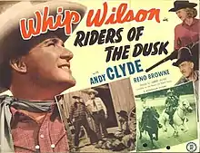 Riders of the Dusk is a 1949 American Western film directed by Lambert Hillyer and written by Adele Buffington and Robert Emmett Tansey. The film stars Whip Wilson, Andy Clyde, Reno Browne, Tris Coffin, Marshall Reed and Myron Healey. The film was released on November 13, 1949, by Monogram Pictures.[1][2][3]