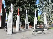 Ridgefield Veterans Memorial is a memorial in Ridgefield, Washington, commemorating locals who died in wars since the Spanish–American War. The memorial features five 10.5-foot (3.2 m) columns, each topped with a flag representing one of the military service branches, was dedicated in November 2012. Approximately 250 people attended the dedication ceremony.[1]
