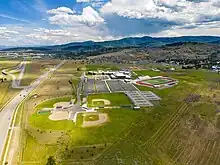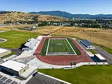 Central Valley School District had been planning for a new high school for 40 years.[11][12] Initial planning for a $129.9 million dollar bond were in motion in early 2017 to fund a number of school district projects, including a new high school.[13] Voters in the district approved the bond measure by 70% in early 2018.[14] Plans in 2017 initially had the new school at land the district had acquired in 1980 that was in the Saltese Flats area.[13][15] The Saltese Flats site had a number of issues, such as building height restrictions that would have required some structures to be built partially underground, as well as the necessity of extending major utilities to the site.[16] The district decided against going over their budget and instead purchased more than 99 acres (40 ha) from the Spokane Gun Club,[17] with the intention of building on that site. Environmental concerns with the Spokane Gun Club site were addressed through a commitment of up to $1 million dollars by the club to clean up lead from the property, with the district covering costs beyond that and the Washington State Department of Ecology inspecting the land.[16][11] Enhanced security was a focus of the new school, including increased cameras and an intercom system for granting entry.[18] Funding for the school was provided by the bond approved by voters as well as matching construction funds from the state.[1][19] On November 26, 2018, a 14-person naming committee selected "Ridgeline High School" as the name of the new school from more than 430 proposed names.[20] Among the three final recommended names were "Saltese High School" and "Chief Andrew Seltice High School". According to the school district, Ridgeline High School was chosen because it was a "strong and powerful" name and also described the local geography of the area.[20] Construction began in late August of 2019,[11][21] with construction completing two years later.[8]