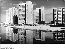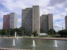The Rieth is connected to the Erfurt city centre by Erfurt Stadtbahn tram lines 1 and 6. The name Rieth frequently appears in Thuringia as a component of place names. These are river floodplains reclaimed in the Middle Ages, which had previously become marshy and had been drained. Today's Rieth district is also located in such a floodplain between the Gera River in the west and the river Schmale Gera in the east. The Rieth was the first GDR housing estate with a complex centre in its centre, but the Johannesplatz was the first prefabricated housing estate to be built in Erfurt in 1965.