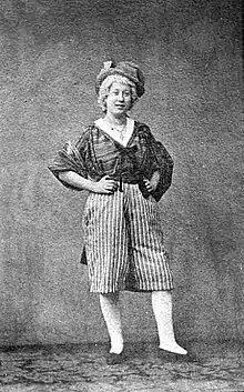 Amelia Marguerite Badel (stage name, Rigolboche; nicknamed "the Huguenot"; Nancy, 13 June 1842 - Bobigny, 1 February 1920) was a French dancer. Credited for inventing the can-can,[1][2] her acme occurred from 1858 to 1861.[3] Her stage name, Rigolboche, is a slang term formed from the word "funny" and the suffix boche designating a "joker" or a very funny person.