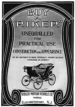The Riker was a veteran and brass era electric car founded in 1898 in Elizabeth, New Jersey. Designed by Andrew L. Riker, they were built in small numbers until the company was absorbed by the Electric Vehicle Company in 1901.[1][2]