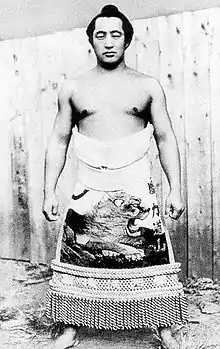 Joining the Nishonoseki stable, Kim debuted in June 1940. At first, his Korean origins were indicated on sumo ranking sheets, and he received harassment and racial discrimination for this.[2] However, he was adopted by Momota and took the name Mitsuhiro Momota, and a story was fabricated that he had been born in Omura, Nagasaki.[2] Despite this, he did not attain Japanese citizenship until 1951.[6] He was given the shikona of Rikidōzan Mitsuhiro (力道山 光浩, Hepburn: Rikidouzan Mitsuhiro). He reached the top makuuchi division in 1946 and was runner-up to yokozuna Haguroyama in the tournament of June 1947, losing a playoff for the championship. He fought in 23 tournaments in total, with a win–loss record of 135–82. His highest rank was sekiwake,[7] though he was reportedly close to a promotion to ōzeki before his retirement.[2]