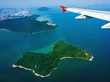 Aerial view of Rimau Island (foreground), southeastern tip of Penang Island (middle) and Jerejak Island (background)